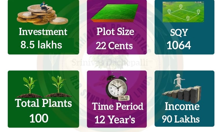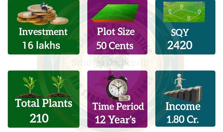The Standard Plan requires an investment of ₹16 lakhs and offers 50 cents of red sandalwood farmland, equivalent to 2,420 square yards. With 210 trees planted on the land, this plan is designed for those seeking a higher return on investment. After 12 years, the expected profit is ₹1.8 crores, making this plan perfect for investors looking for larger land ownership and substantial financial growth.